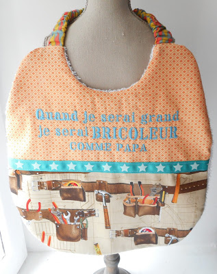 J'ai utilisé du drap ancien blanc sur une face et un tissu dans les tons bleu acheté chez Mondial Tissus sur l'autre face. L'ange vient de chez "A vous de broder" et l'écusson est offert par un cœur de bébé (merci à elle !!).